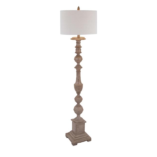 Add a glow to any room with this traditional turned wood floor lamp in a weathered finish and linen drum shade.