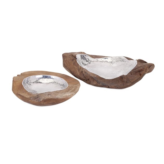 Lined with hammered aluminum this set of two natural teak wood bowls possess a natural sophistication.