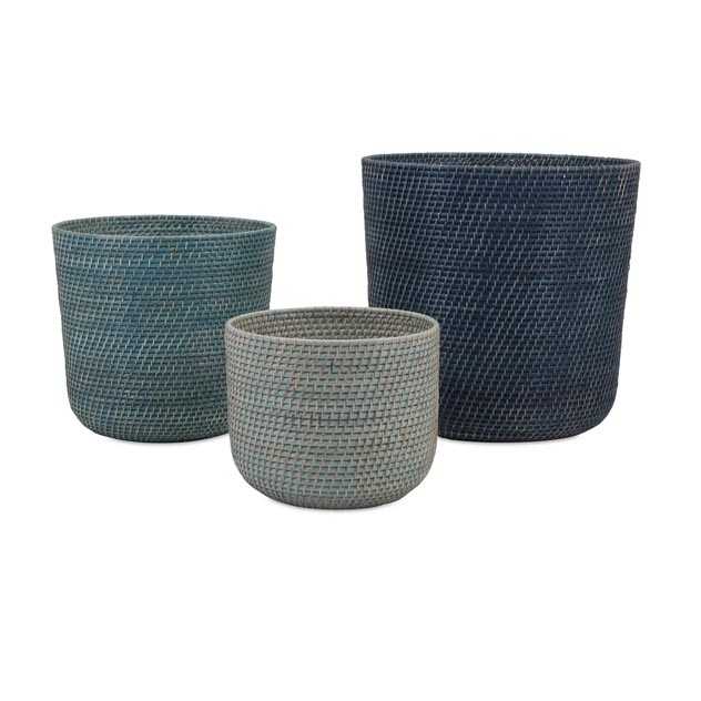 Store essentials in style with this three piece set of finely woven rattan baskets in shades of blue and turquoise.