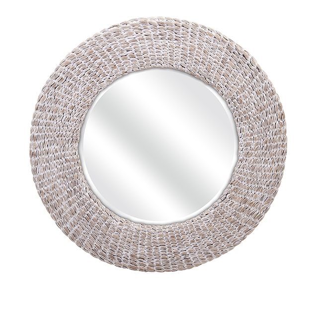This sophisticated round wall mirror features a wide woven frame in a weathered white finish.