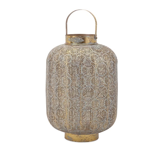 - The large Elliot lantern made of pierced metal features an aged patina over a gold finish.