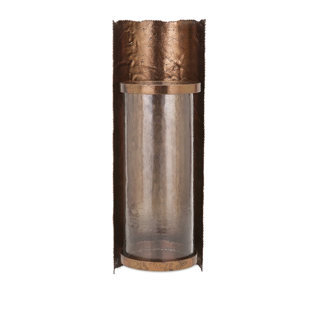 Robed in metal and encased in a crackled glass hurricane candlelight takes on an especially ethereal glow in this artful wall sconce
