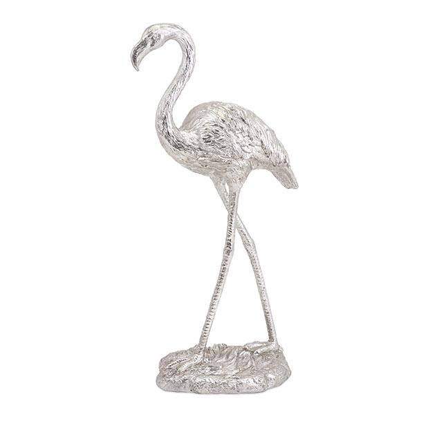 A far cry from the pink plastic lawn ornaments: This silvered statue of a flamingo is a sophisticated take on the tropical theme realistically rendered in poly resin and stone powder.