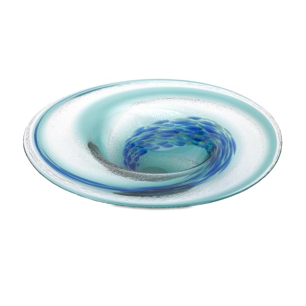 This elegant handcrafted artisan glass charger features a swirl design in blues and grays.