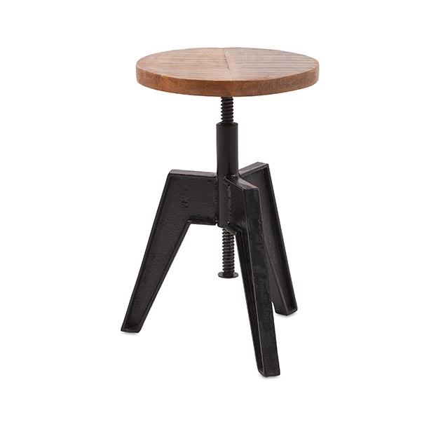 This industrial style round wood stool with a three leg metal base is height adjustable.