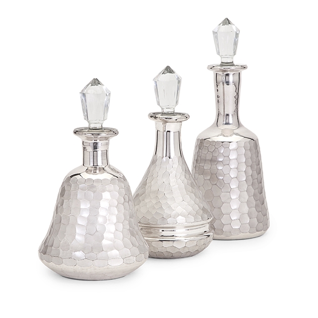 Rich beautiful silver glass is enhanced in this set of three lidded bottles
