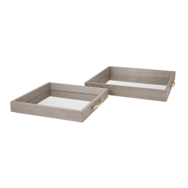 Muted neutral faux leather and unique gold handles add a refined look to this set of mirrored trays which are the epitome of luxury and sophistication while at the same time functional. Set of 2