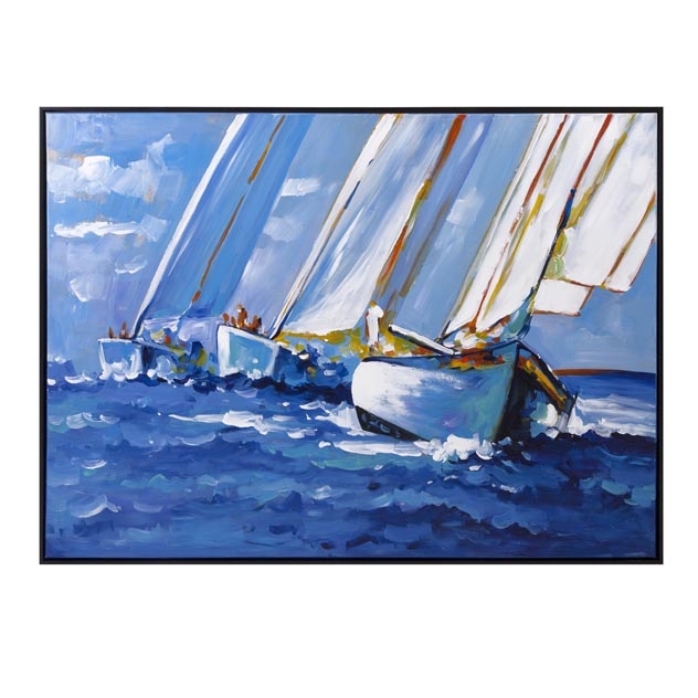 - A spirited yacht race in vibrant blue orange and white is depicted in this coastal-inspired oil painting with floating frame.