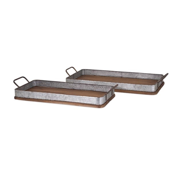 A corrugated metal design adds an industrial rustic style to this set of two narrow wood bottom trays.