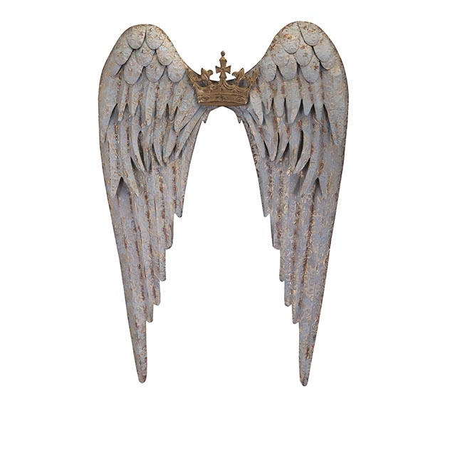 This Paris-inspired metal wall decor features a pair of gold tipped angel wings with gold crown center detail.