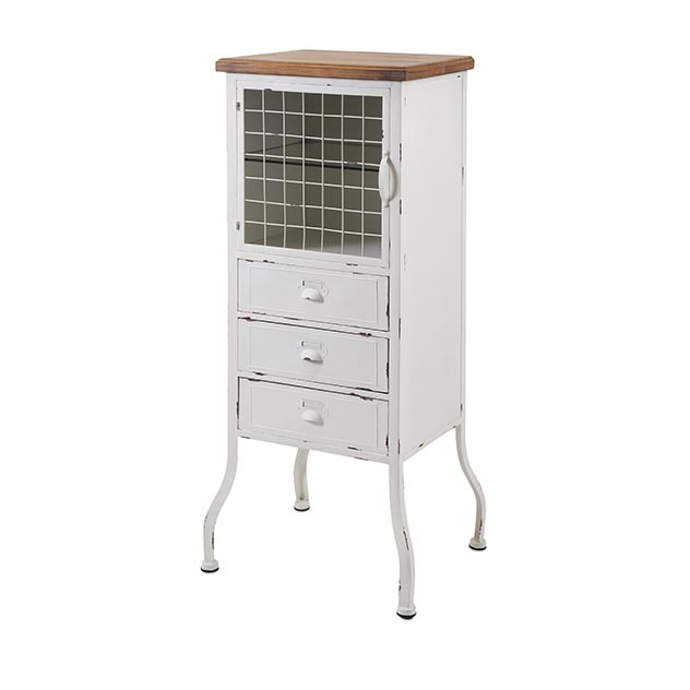 This vintage style metal storage cabinet features a wood top three storage drawers and a weathered white finish.