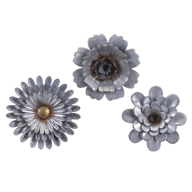 Add a floral touch with this set of three galvanized metal wall flowers.