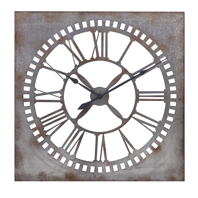 This galvanized metal wall clock features a laser cut design and a lightly oxidized finish.