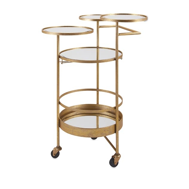 Modern glass and metal bar cart features four serving tiers an antiqued gold finish and three casters for easy mobility.