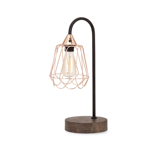 With a polished copper wire shade this modern table lamp blooms above a wood base and features the warm glow of an Edison style bulb.