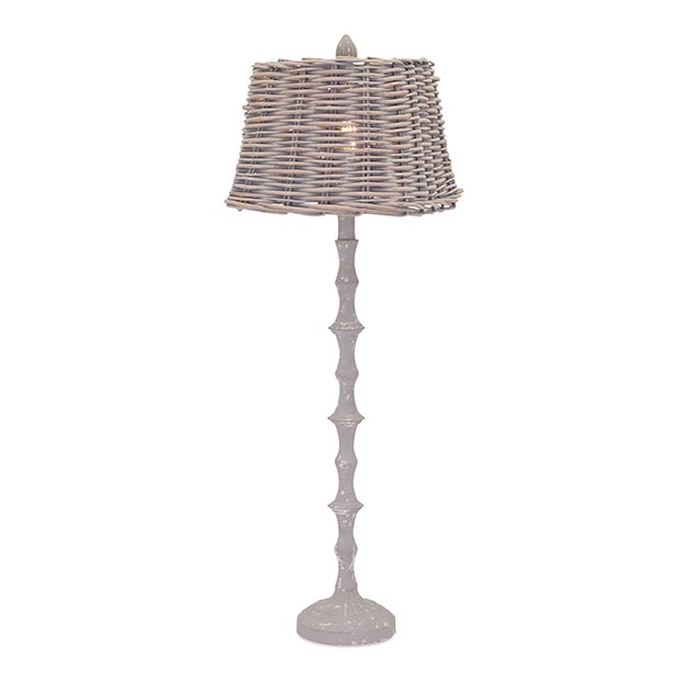This handcrafted slim buffet lamp features a turned wood base and a natural woven rattan shade.