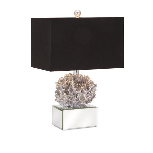 - This sculptural faux sea coral statuary serves dual purppose as a statement piece and table lamp on a mirrored base and black rectangle shade.