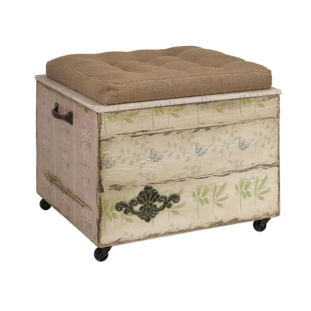 | Another delightful design by Ella Elaine this storage ottoman features a tufted linen seat on a wooden crate with casters. Antique wall paper iron handles and decorative metal flourishes all contribute to the vintage charm of this unique piece.