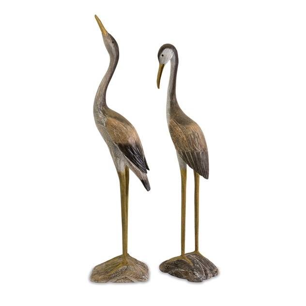 Coastal set of two pinewood cranes with realistic coloring. Complementary poses with one crane looking upward and the other down. 100% pinewood