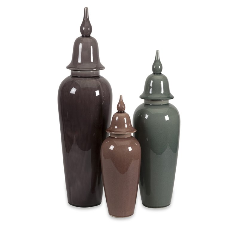 | IMAX Corporation - Vases / Urns - 642203 - The softer side of jewel toned colors accentuate this set of three lidded urns in small, medium and large sizes. Add both style and comfort to your living space with this attractive collection. The subtle coloration of this lovely collection allows it to blend in easily with any color scheme or style of decor Finish: Multi-ColorMaterial: 100% CeramicHand FinishedSpecifications:Product Dimensions (Item 1): 16 H x 5 W x 5 DProduct Dimensions (Item 2): 21 H x 6 W x 6 DProduct Dimensions (Item 3): 28 H x 7 W x 7 DOverall Product Weight: 17 lbs