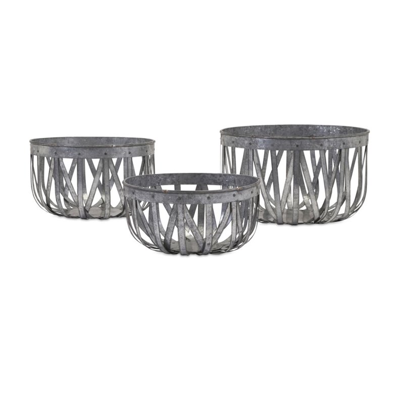 | IMAX Corporation - Baskets - 848473 - This set of three galvanized metal openwork baskets will add rustic, industrial style to any tabletop. Add both style and comfort to your living space with this attractive collection. The subtle coloration of this lovely collection allows it to blend in easily with any color scheme or style of decor Finish: GrayMaterial: 100% Iron GalvanizedHand FinishedSpecifications:Product Dimensions (Item 1): 7.5 H x 13 W x 14 DProduct Dimensions (Item 2): 10 H x 15 W x 16 DProduct Dimensions (Item 3): 11.5 H x 16.5 W x 18 DOverall Product Weight: 12 lbs