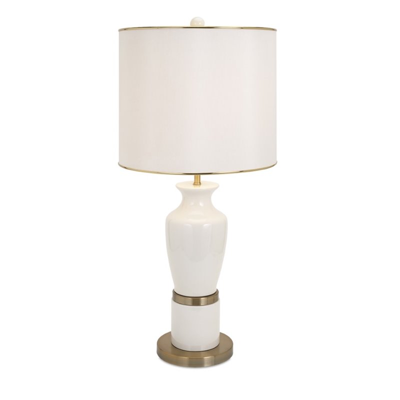 | IMAX Corporation - Table Lamps - 86630 - The BAK Home Collection is all about making maximum impact with minimum effort. Designer Beth Kushnick creates a serene example of simple luxury lighting with the Prestine ceramic lamp. It's cream colored body is accented by brass toned bands and a drum shade. Add both style and comfort to your living space with this attractive collection. The subtle coloration of this lovely collection allows it to blend in easily with any color scheme or style of decor Finish: WhiteMaterial: 70% Ceramic, 10% Polyester, 10% Iron, 5% PlasticHand FinishedSpecifications:Overall Product Dimensions: 32 H x 15 W x 15 DOverall Product Weight: 10 lbs