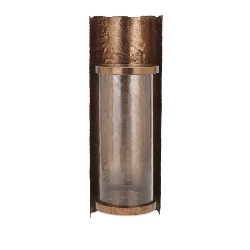 | IMAX Corporation - Candle Holders / Lanterns - 20273 - Robed in metal and encased in a crackled glass hurricane, candlelight takes on an especially ethereal glow in this artful wall sconce. Add both style and comfort to your living space with this attractive collection. The subtle coloration of this lovely collection allows it to blend in easily with any color scheme or style of decor Finish: CopperMaterial: 31% Glass; 69% IronHand FinishedSpecifications:Overall Product Dimensions: 21.75 H x 7.75 W x 8.25 DOverall Product Weight: 8 lbs