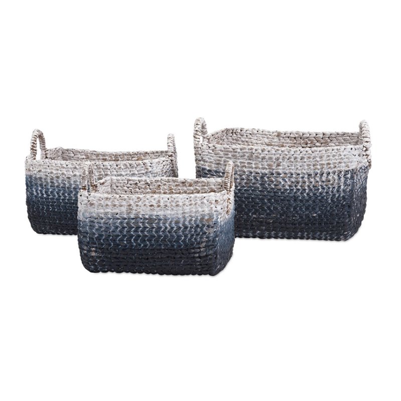 | IMAX Corporation - Baskets - 116013 - Form meets function in this trio of cascade woven water hyacinth baskets with handles. Designed to keep clutter at bay, the baskets are set apart by a wave of ombre-inspired color that will blend beautifully with existing decor. Add both style and comfort to your living space with this attractive collection. The subtle coloration of this lovely collection allows it to blend in easily with any color scheme or style of decor Finish: BlueMaterial: 80% Waterhyacinth; 20% RattanHand FinishedSpecifications:Product Dimensions (Item 1): 9 H x 13.25 W x 9 DProduct Dimensions (Item 2): 12.25 H x 16.25 W x 10.25 DProduct Dimensions (Item 3): 1 H x 19.5 W x 14 DOverall Product Weight: 6 lbs