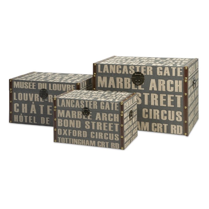 | IMAX Corporation - Accent Chests - 680623 - Emblematizing with words the various wonders London has to offer, this set of three storage trunks make a bold statement, while simultaneously storing away your things. Add both style and comfort to your living space with this attractive collection. The subtle coloration of this lovely collection allows it to blend in easily with any color scheme or style of decor Finish: Multi-ColorMaterial: 50% Mdf, 45% Canvas, 5% Copper Fitting And PuHand FinishedSpecifications:Product Dimensions (Item 1): 11.75 H x 19.75 W x 11 DProduct Dimensions (Item 2): 13.5 H x 23.75 W x 14.75 DProduct Dimensions (Item 3): 18.5 H x 28 W x 17.75 DOverall Product Weight: 53 lbs