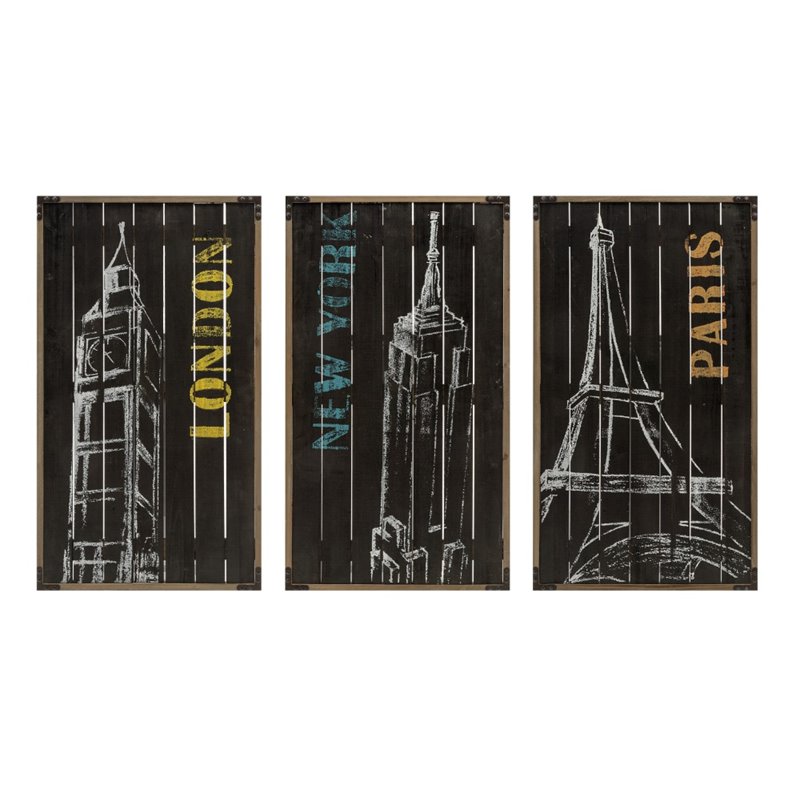 | IMAX Corporation - Prints / Paintings - A0374420 - Chalk it up to the latest trend in wall decor. Three fir panels form a hip triptych drawn with well-known symbols of London, Paris and New York. Add both style and comfort to your living space with this attractive collection. The subtle coloration of this lovely collection allows it to blend in easily with any color scheme or style of decor Finish: Multi-ColorMaterial: 90% Fir, 10% IronHand FinishedSpecifications:Individual Product Dimensions: 37.25 H x 21.25 W x 1.25 DOverall Product Weight: 6 lbs
