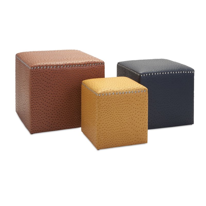 | IMAX Corporation - Ottomans - 520163 - Take a seat or put your feet up in high style with a trio of leather-look ottomans in rich neutral colors set apart with an embossed ostrich pattern and silver nailhead trim. Add both style and comfort to your living space with this attractive collection. The subtle coloration of this lovely collection allows it to blend in easily with any color scheme or style of decor Finish: Multi-ColorMaterial: 50% Mdf; 40% Pu; 10% IronHand FinishedSpecifications:Product Dimensions (Item 1): 13.5 H x 12.25 W x 12.25 DProduct Dimensions (Item 2): 15.5 H x 15.5 W x 15.5 DProduct Dimensions (Item 3): 17.5 H x 19.75 W x 19.75 DOverall Product Weight: 37 lbs