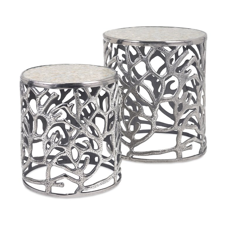 | IMAX Corporation - Accent Tables - 601502 - If you like pina coladas, this pair of coastally inspired aluminum tables are the perfect place to rest your glass between sips. Add both style and comfort to your living space with this attractive collection. The subtle coloration of this lovely collection allows it to blend in easily with any color scheme or style of decor Finish: SilverMaterial: 100 % AluminiumHand FinishedSpecifications:Product Dimensions (Item 1): 16 H x 13.25 W x 13.25 DProduct Dimensions (Item 2): 19.5 H x 16.25 W x 16.25 DOverall Product Weight: 25 lbs