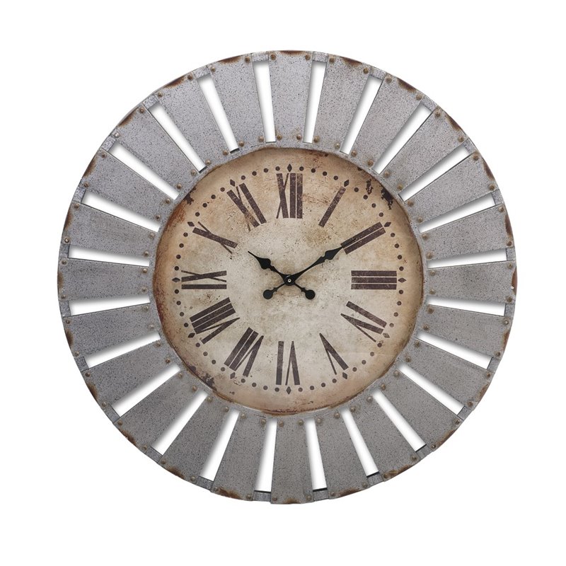| IMAX Corporation - Wall Clocks - 85816 - This oversized wall clock features ironwork in a finish inspired by galvanized metal. The roman numerals are enhanced by an antiqued finish, adding tons of style to any home. Add both style and comfort to your living space with this attractive collection. The subtle coloration of this lovely collection allows it to blend in easily with any color scheme or style of decor Finish: GrayMaterial: 50% Iron, 25% Glass, 25% MdfHand FinishedSpecifications:Overall Product Dimensions: 41 H x 3.25 W x 3.25 DOverall Product Weight: 24 lbs