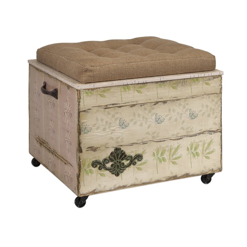 | IMAX Corporation - Ottomans - 47472 - Another delightful design by Ella Elaine, this storage ottoman features a tufted linen seat on a wooden crate with casters. Antique wall paper, iron handles and decorative metal flourishes all contribute to the vintage charm of this unique piece. Add both style and comfort to your living space with this attractive collection. The subtle coloration of this lovely collection allows it to blend in easily with any color scheme or style of decor Finish: BrownMaterial: 55% Fir, 30% Mdf, 10% Sponge, 5% BurlapHand FinishedSpecifications:Overall Product Dimensions: 20.5 H x 17.5 W x 16.5 DOverall Product Weight: 15 lbs