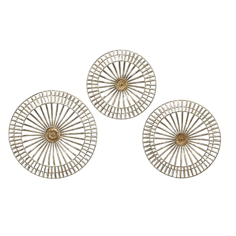 | IMAX Corporation - Small Accents - 742863 - You'll love the intricate details of the Jennings Metal Discs. Perfect for above a mantel or desk, the shield-like shape delivers strength and the floral medallion center softens them with a classic touch. Add both style and comfort to your living space with this attractive collection. The subtle coloration of this lovely collection allows it to blend in easily with any color scheme or style of decor Finish: GoldMaterial: 100% Wrought IronHand FinishedSpecifications:Product Dimensions (Item 1): 16 H x 16 W x 5.25 DProduct Dimensions (Item 2): 18.5 H x 18.5 W x 5.25 DProduct Dimensions (Item 3): 20.5 H x 20.5 W x 5.25 DOverall Product Weight: 7 lbs