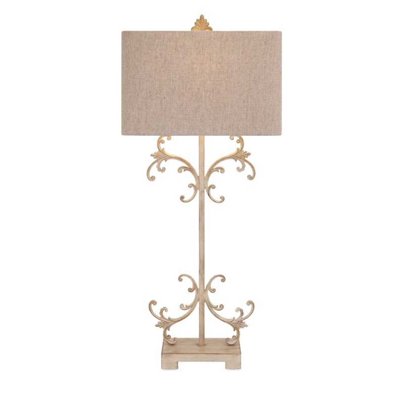 | IMAX Corporation - Table Lamps - 31446 - Add a glow to your decor with this chic scrolled metal table lamp in a weathered cream finish. Designed by Becky Fletcher. Add both style and comfort to your living space with this attractive collection. The subtle coloration of this lovely collection allows it to blend in easily with any color scheme or style of decor Finish: BeigeMaterial: 80% Iron, 20% LinenHand FinishedSpecifications:Overall Product Dimensions: 35.5 H x 15 W x 7.5 DOverall Product Weight: 5 lbs