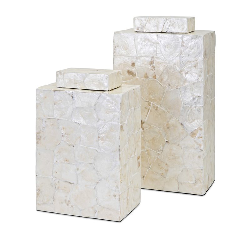 | IMAX Corporation - Jars / Canisters - 311442 - This coastal-inspired pair of square containers with lids are crafted of shiny capiz shell to add natural glitz to any home. Set of two. Add both style and comfort to your living space with this attractive collection. The subtle coloration of this lovely collection allows it to blend in easily with any color scheme or style of decor Finish: BeigeMaterial: 60% Mdf, 30% Capiz Shell, 10% LacquerHand FinishedSpecifications:Product Dimensions (Item 1): 14.5 H x 9.25 W x 6 DProduct Dimensions (Item 2): 19.25 H x 10.5 W x 6 DOverall Product Weight: 13 lbs
