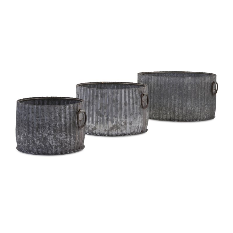 | IMAX Corporation - Flower Pots / Planters - 848403 - Add a rustic touch with this set of three corrugated planters fashioned of galvanized metal with ring carry handles. Add both style and comfort to your living space with this attractive collection. The subtle coloration of this lovely collection allows it to blend in easily with any color scheme or style of decor Finish: GrayMaterial: 100% Iron GalvanizedHand FinishedSpecifications:Product Dimensions (Item 1): 8 H x 11 W x 10.75 DProduct Dimensions (Item 2): 9 H x 13.5 W x 14.75 DProduct Dimensions (Item 3): 9.5 H x 17.5 W x 18.25 DOverall Product Weight: 13 lbs