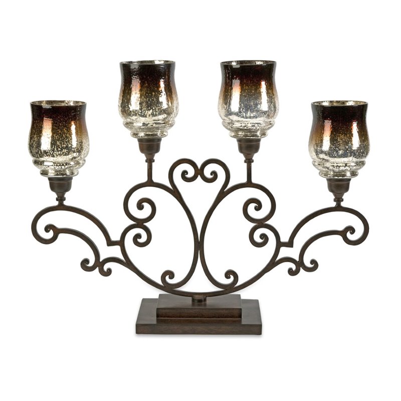 | IMAX Corporation - Candle Holders / Lanterns - 20074 - The deep chocolate tone of the hurricane has an ombre effect and fades into the classic mirrored finish of mercury glass, giving this oversized candelabra a dramatic appearance. Holds pillar candles. Made of 75% Iron, 25% GlasSpecifications:Overall Product Dimensions: 22 H x 7 W x 28 DTotal Weight: 19.25 lbs