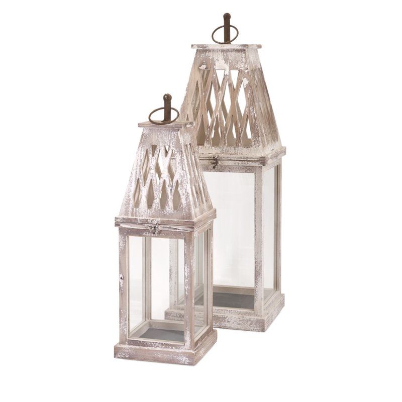 | IMAX Corporation - Candle Holders / Lanterns - 893612 - This rustic set of two fir wood lanterns in a rustic white finish will add farmhouse style to your tabletop. Add both style and comfort to your living space with this attractive collection. The subtle coloration of this lovely collection allows it to blend in easily with any color scheme or style of decor Finish: BeigeMaterial: 80% Fir, 18% Glass, 2% Hard-Drawn Wire (Iron)Hand FinishedSpecifications:Product Dimensions (Item 1): 24 H x 8 W x 8 DProduct Dimensions (Item 2): 31.5 H x 11.5 W x 10.5 DOverall Product Weight: 13 lbs