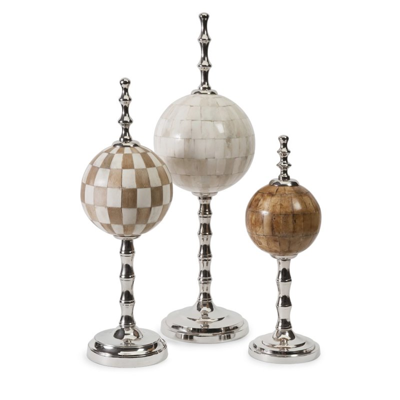 | IMAX Corporation - Statuettes / Figurines - 199333 - With inlaid bone globes suspended on chrome stands, the Randolph bone finials make a sophisticated statement on a tabletop, desk or shelf. Add both style and comfort to your living space with this attractive collection. The subtle coloration of this lovely collection allows it to blend in easily with any color scheme or style of decor Finish: BrownMaterial: 70% Bone, 30% AluminumHand FinishedSpecifications:Product Dimensions (Item 1): 14 H x 5 W x 5 DProduct Dimensions (Item 2): 18 H x 6 W x 6 DProduct Dimensions (Item 3): 21 H x 7 W x 7 DOverall Product Weight: 9 lbs
