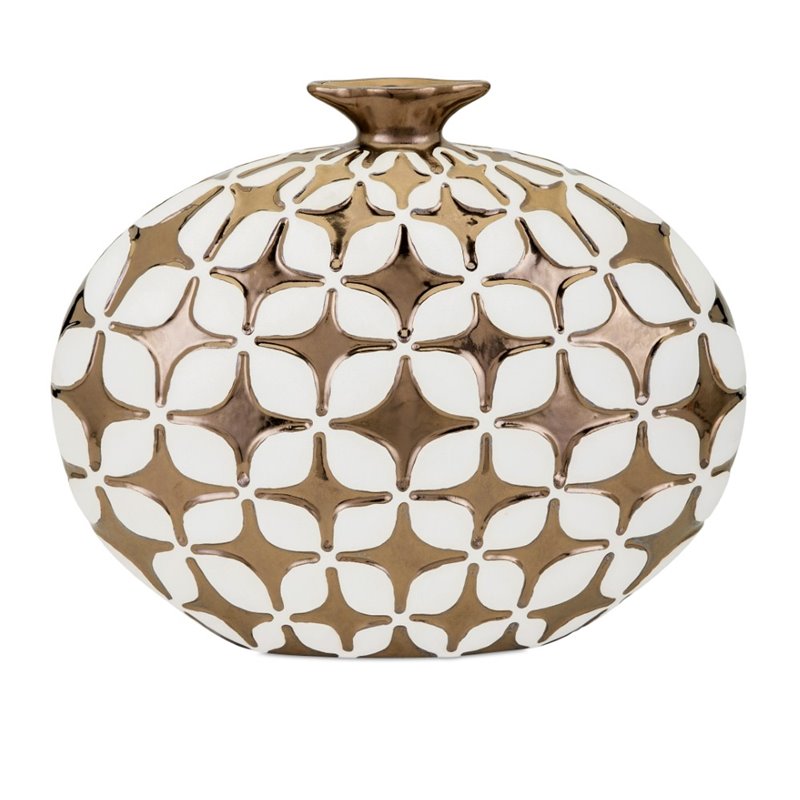 | IMAX Corporation - Vases / Urns - 95210 - Add retro style with this short clay vase in a white and reflective gold embossed finish. Add both style and comfort to your living space with this attractive collection. The subtle coloration of this lovely collection allows it to blend in easily with any color scheme or style of decor Finish: GoldMaterial: 90% Clay, 10% GlazeHand FinishedSpecifications:Overall Product Dimensions: 15 H x 18.5 W x 5 DOverall Product Weight: 13 lbs