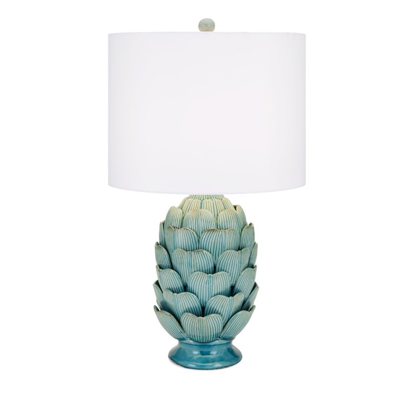 | IMAX Corporation - Table Lamps - 59251 - Add organic flair with this artichoke ceramic table lamp in turquoise with a white drum shade. Add both style and comfort to your living space with this attractive collection. The subtle coloration of this lovely collection allows it to blend in easily with any color scheme or style of decor Finish: TealMaterial: 80% Ceramic, 20% CottonHand FinishedSpecifications:Overall Product Dimensions: 29.5 H x 9.5 W x 9.5 DOverall Product Weight: 15 lbs