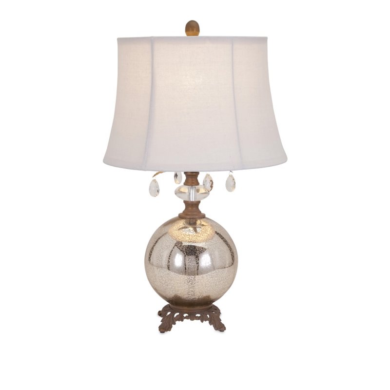 | IMAX Corporation - Table Lamps - 31447 - This unique Victorian style table lamp features a glass globe base, linen bell shade and acrylic crystal pendants. Designed by Becky Fletcher. Add both style and comfort to your living space with this attractive collection. The subtle coloration of this lovely collection allows it to blend in easily with any color scheme or style of decor Finish: GoldMaterial: 35%Iron 35%Glass 20%Linen 10% AcrylicHand FinishedSpecifications:Overall Product Dimensions: 25 H x 12 W x 12 DOverall Product Weight: 4 lbs